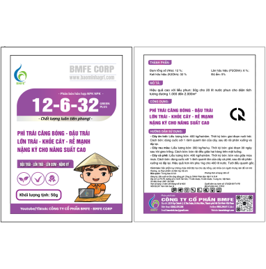 NPK 12-6-32 GreenPlus là dòng phân bón chất lượng cao do Công Ty Cổ Phần BMFE phân phối, chuyên dùng trong giai đoạn nuôi trái – lên màu – tăng trọng. Với tỷ lệ Kali cao vượt trội (32%), sản phẩm mang đến hiệu quả nổi bật trong việc nuôi trái lớn, lên màu đẹp, tăng độ đường và nặng ký trái.